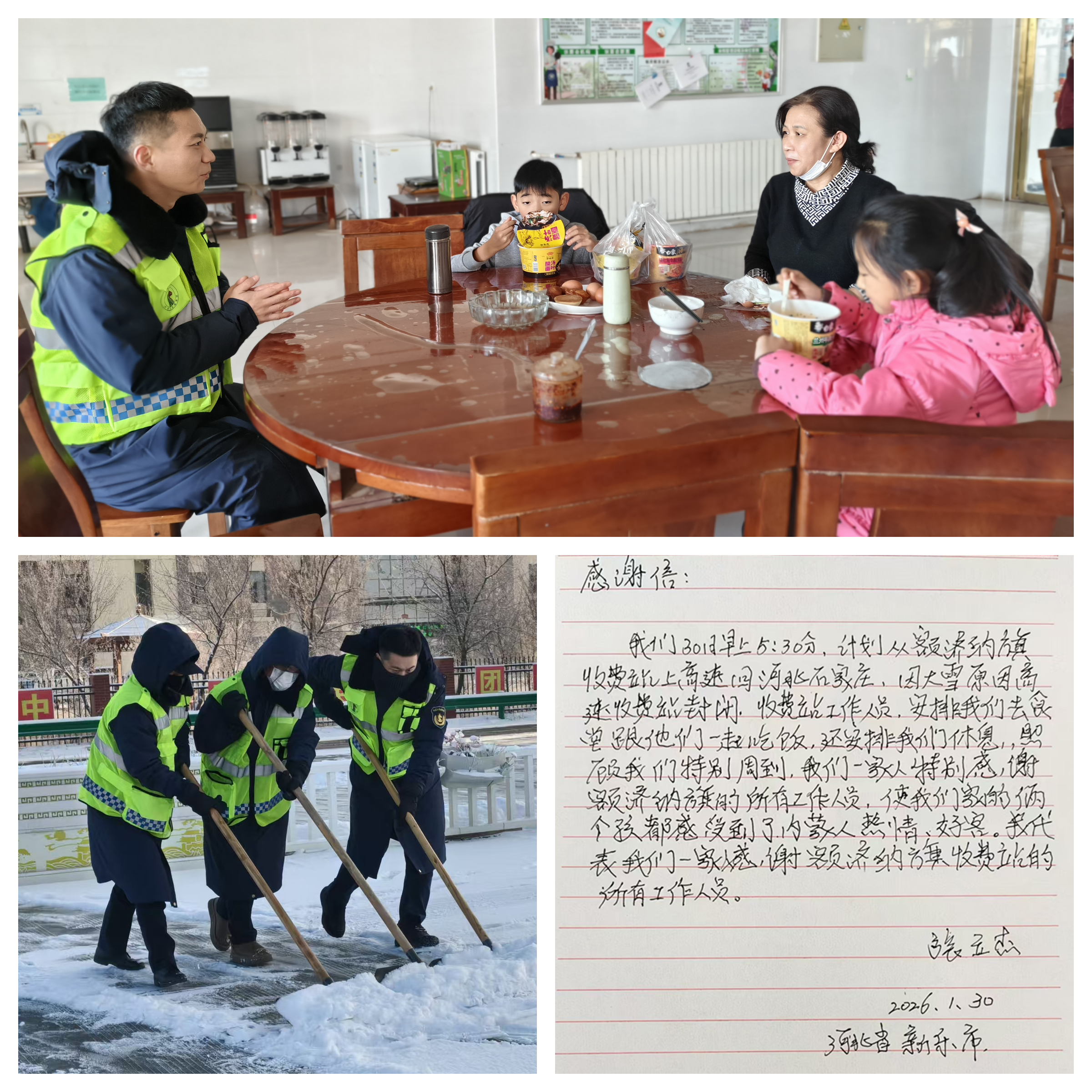 额济纳旗收费所始终坚守“雪情就是命令,保通就是责任”的信念,在风雪一线全力开展除雪保畅工作,并以细致温暖的服务,护航每一位旅客的平安归途。