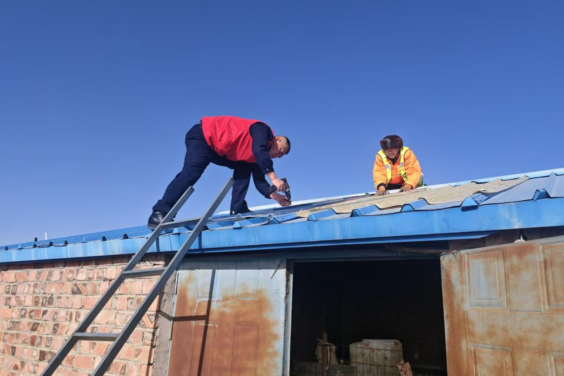 接到求助后,工作人员立即携带工具上门处理。工作人员首先协助老人更换灯泡,排查线路并紧固松动的接口,迅速恢复室内照明;随后爬上羊圈棚顶,利用现有材料加固松动的彩钢板,将破损处对齐压实并用螺丝固定,彻底消除漏风漏雨隐患。维修过程中,工作人员告知老人今后有日常需求可随时联系,服务区将及时提供帮助。老人连连道谢,露出欣慰笑容。
