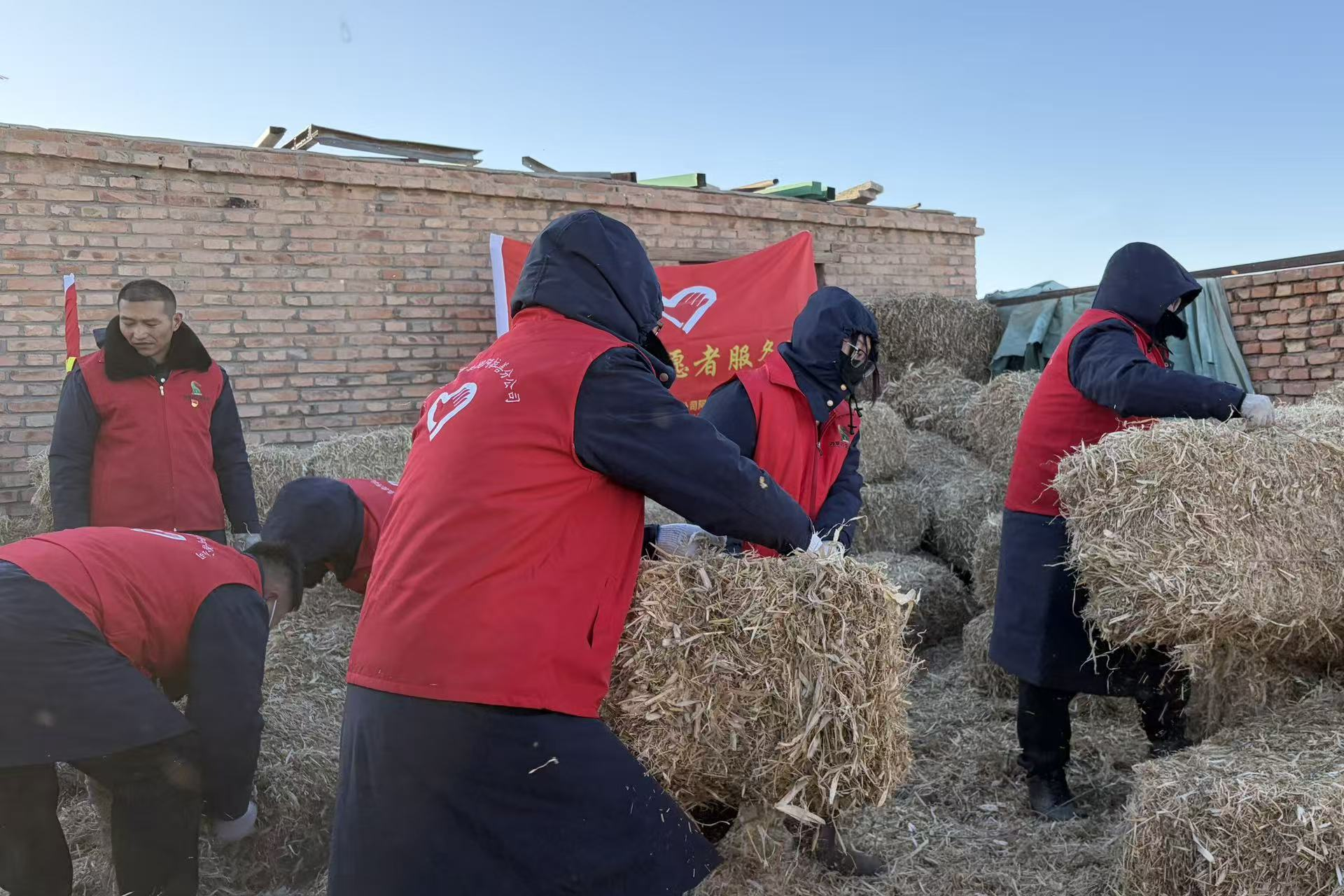 时值冬季饲草料储备关键期,红古尔玉林收费所党支部通过前期走访了解到,德日图嘎查内1户困难牧户因缺乏青壮劳动力,草料装卸码放陷入困境,直接影响牲畜越冬保障。了解这一情况后,党支部迅速响应,第一时间组建党员带头、团员跟进的志愿队伍奔赴草场。活动中,志愿者们分工明确、默契配合,在寒风凛冽的草场上井然有序地开展搬草、传递、码放等工作。大家不惧严寒、不辞辛苦,连续奋战约3小时,高效完成近五吨饲草料的卸载、传递与码放,及时解决了牧户的急难问题,确保了牲畜安全越冬的饲草储备。
