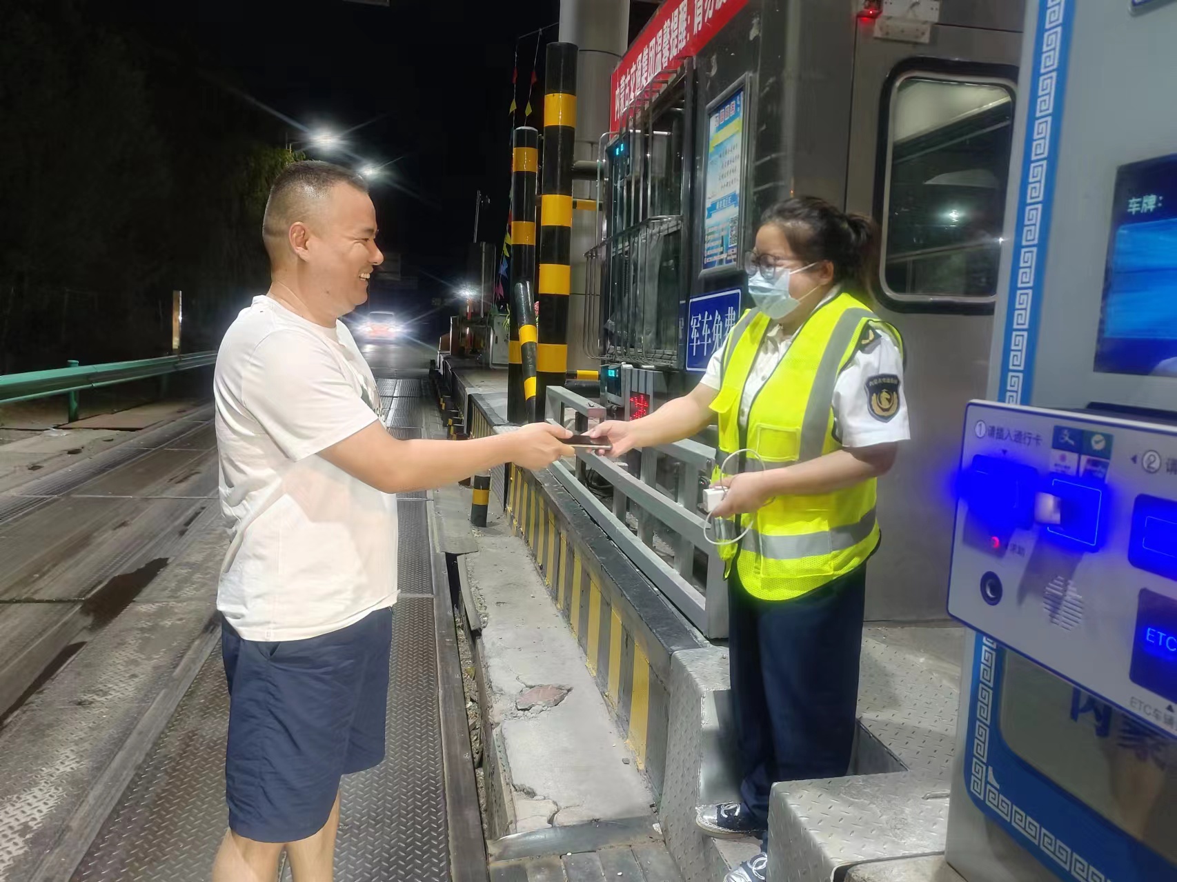 7月3日,凌晨十二点十五分,一位驾驶员焦急的等候在收费站出口广场,收费员常慧发现后立即上前询问情况。经了解,驾驶员张师傅在长途驾驶过程中,手机电量耗尽,无法导航及联系家人,也不能支付通行费。了解情况后,常慧立即帮助张师傅为手机充电,让他能够更加安心、顺利地完成行程。张师傅拿着充好电的手机连连道谢。