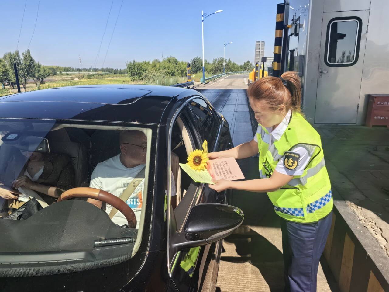在这个充满爱意的七夕节里,临河高速公路收费所内洋溢着温馨与浪漫的气息,工作人员们用独特的方式为过往司乘送上特别的节日祝福。当车辆驶入收费站,工作人员微笑着递上向日葵花和卡片,向司乘们致以七夕节的问候。