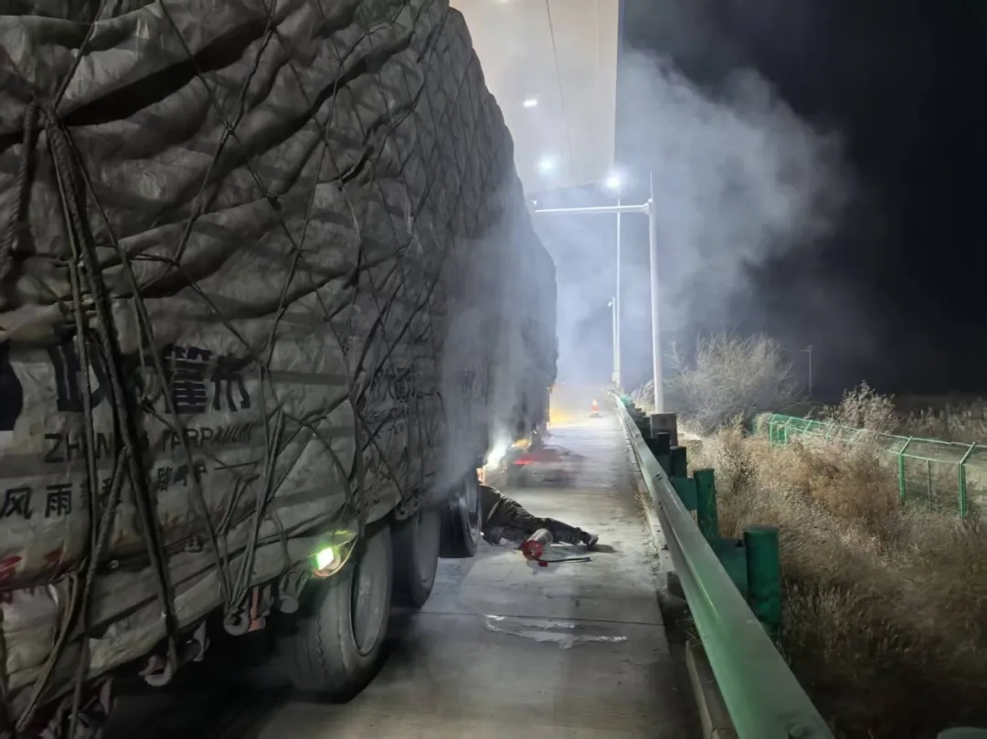 当日0时40分,一辆满载草捆的六轴货车驶入青山收费站入口车道。收费班长发现该车辆尾部冒出阵阵浓烟,车底甚至可见火苗闪动。他迅速判断这是轮胎摩擦过热引发的初期火情,果断提起灭火器冲向现场。“师傅,您的车着火了,快往前开到安全区!”他一边指挥司机将车辆驶离收费区域,一边精准操作灭火器,对准火源喷射干粉。整个过程衔接紧密、动作果断,不到两分钟,火势被彻底控制,险情成功排除。