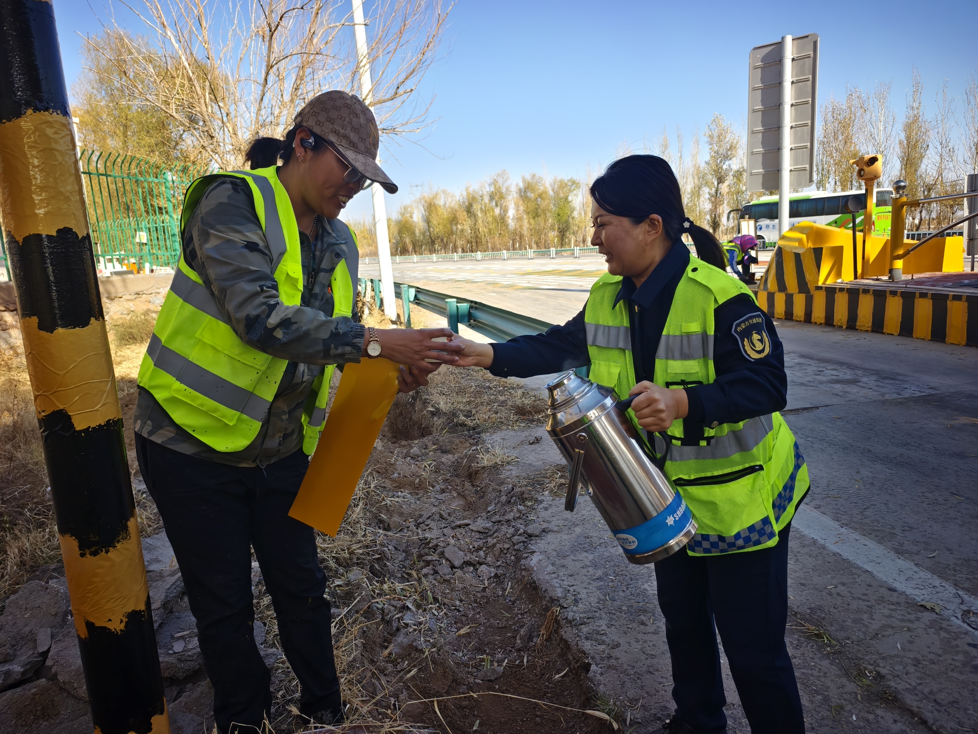 施工期间,收费员们坚守岗位,积极协调施工区域交通秩序,面对施工改造带来的通行调整与现场管理挑战,收费员们迅速行动,他们化身“交通指挥官”,在挖掘机等频繁作业的道口,以规范手势引导机械安全通行,避免施工与车辆通行产生冲突;根据施工进度动态划分通行区域,确保车辆分流有序。在保障施工效率和车辆顺利通行的同时,收费员们的目光也聚焦在一线施工人员的辛劳上。“天凉,喝口热水歇一歇!”简单的话语和温暖的热水,让忙碌的施工人员倍感贴心。他们都在这一暖心举动中感受到了尊重与温暖,施工的疲惫也随之消解了不少。
