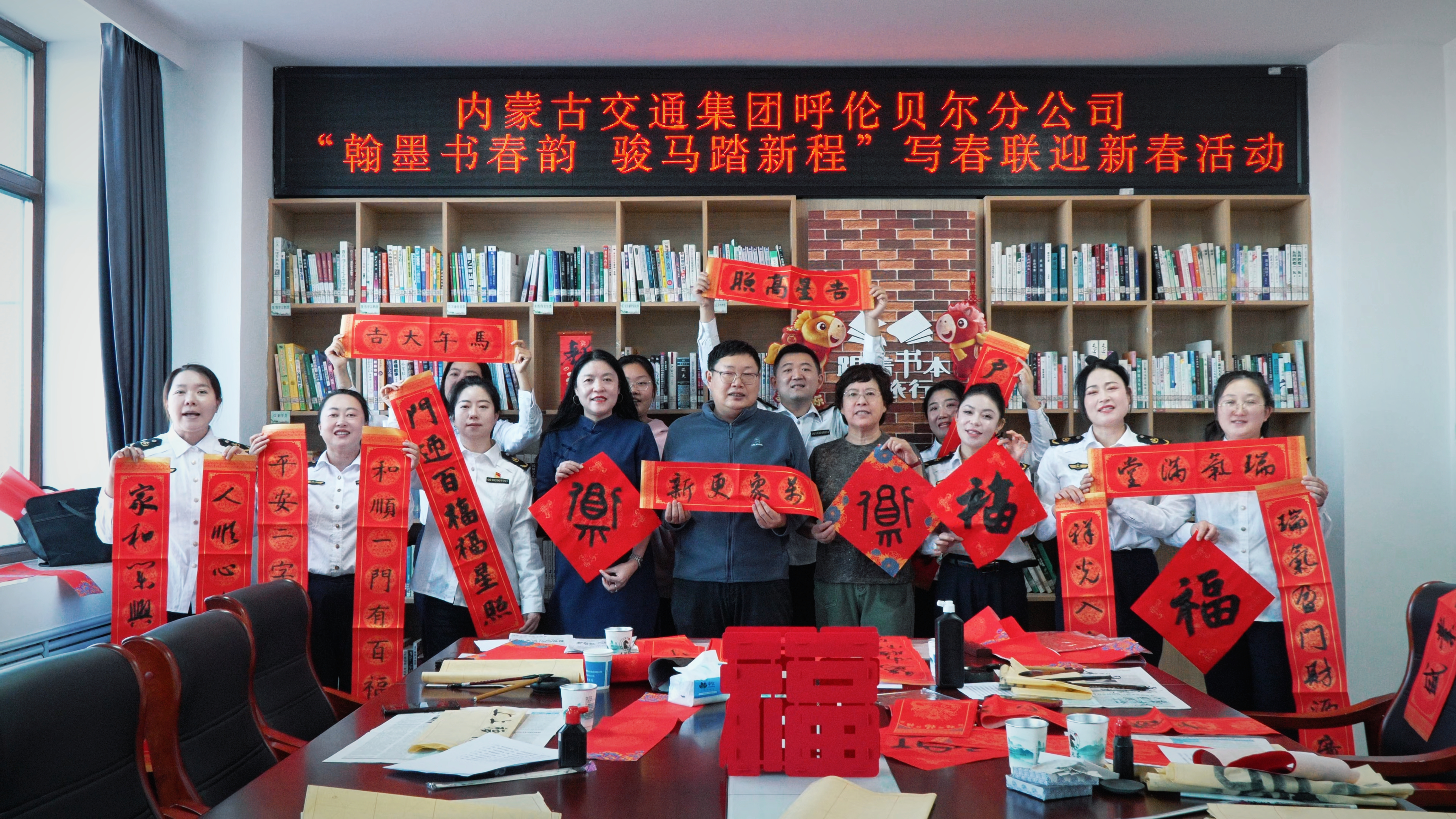 北疆冬韵融春意,墨香盈庭贺新岁!在新春来临之际,为传承中华优秀传统文化,让职工在浓厚的文化氛围中迎接新春佳节,内蒙古交通集团呼伦贝尔分公司联合呼伦贝尔市图书馆开展“翰墨书春韵 骏马踏新程”迎新春写春联送祝福活动,以笔墨传祝福,以初心迎新春。 活动特邀海拉尔区书法家协会老师走进分公司,现场挥毫泼墨,为职工们书写寓意吉祥的春联和“福”字,讲解书法艺术传统文化,细致地介绍了“福”字、“年”字的起源与演变,讲解了春联的历史渊源、张贴习俗等传统知识,让职工们深入了解春联背后的文化内涵。 活动现场年味十足,处处洋溢着欢声笑语。职工们纷纷拿起毛笔向书法家请教书写技巧,从握笔姿势到运笔方法,书法家耐心指导、细致示范,一撇一捺,凝草原新春暖意。一字一联,寄交通奋进初心。墨香与欢声笑语交织,将活动气氛推向高潮。 在新的一年,呼伦贝尔分公司职工将美好祈愿写进春联,把对新春的祝福、对交通事业的期许融进每一笔书写,以昂扬姿态奔赴新征程,让蒙古马精神在交通奋进之路上熠熠生辉,一路畅行!