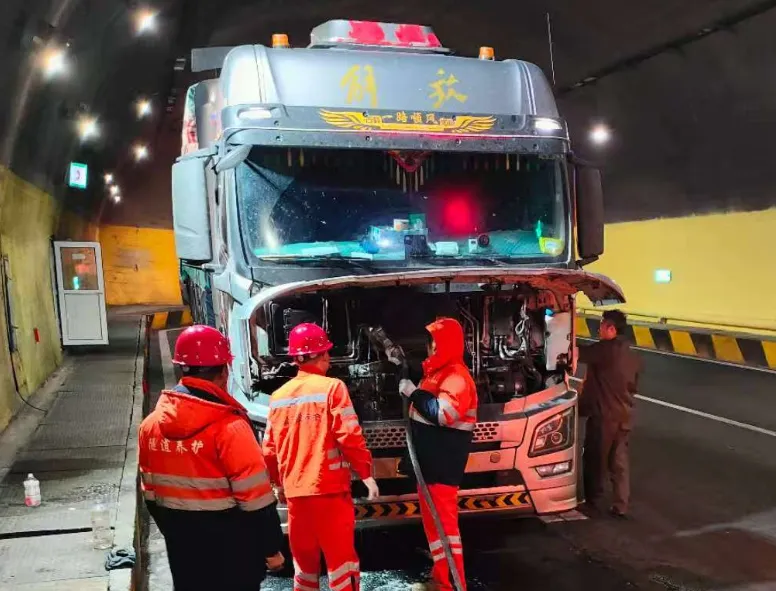 兴安岭隧道管理所为抛锚货车排查故障,协助向水箱内加水,安抚司机情绪,引导后车避让,保障隧道内车辆安全通行。