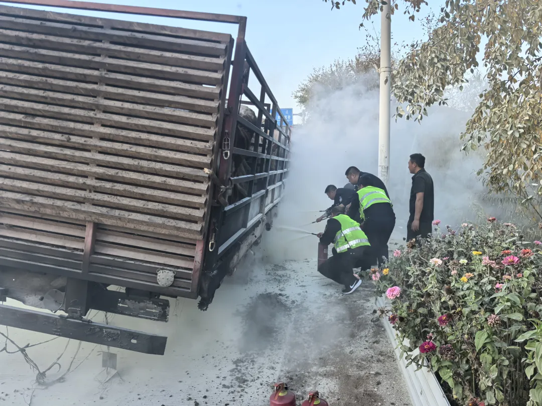 大时尼奇收费所全员响应,迅速为拉牛货车进行紧急灭火,此次救援更让价值数十万元的活牛全部安然无恙,未引发货车及周边道路发生二次事故。