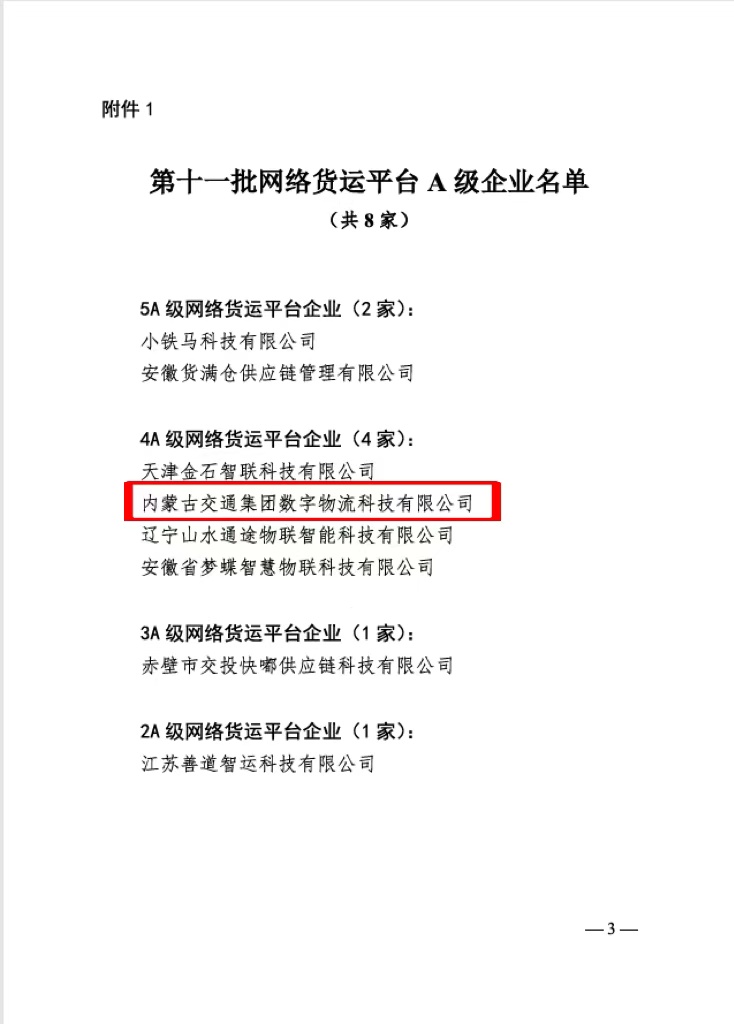 9月27日,根据中国物流与采购联合会《关于发布第十一批网络货运平台A级企业名单的公告》(物联评估字〔2025〕177号),内蒙古交通集团数字物流科技有限公司被授予“网络货运平台4A级企业”称号。这不仅是对公司扛牢使命职责、奋力推动发展的肯定,更为公司做强做优数字物流产业,带动引领自治区物流产业向集约化、数字化、规模化方向发展提供了强大动力。