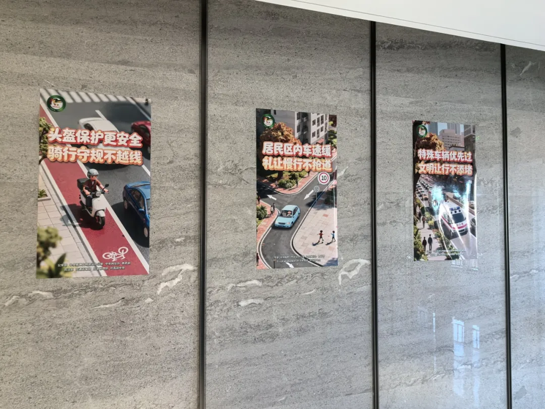 活动前夕,在办公楼公共区域张贴了主题宣传海报,以弘扬法治精神、倡导文明出行为核心,通过生动插画与简洁标语,将骑行安全、社区出行、道路通行礼仪等场景的文明交通要求具象化。