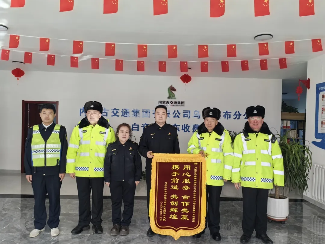 近日,交警支队集阿高速大队一行来到白音察干东收费所,将一面印有“用心服务 合作共赢 携手共进 共创辉煌”的锦旗送到所内,对收费所在联勤联动、保通保畅、打击偷逃费、应急处置等工作中给予大力支持和高效协作表示衷心感谢。