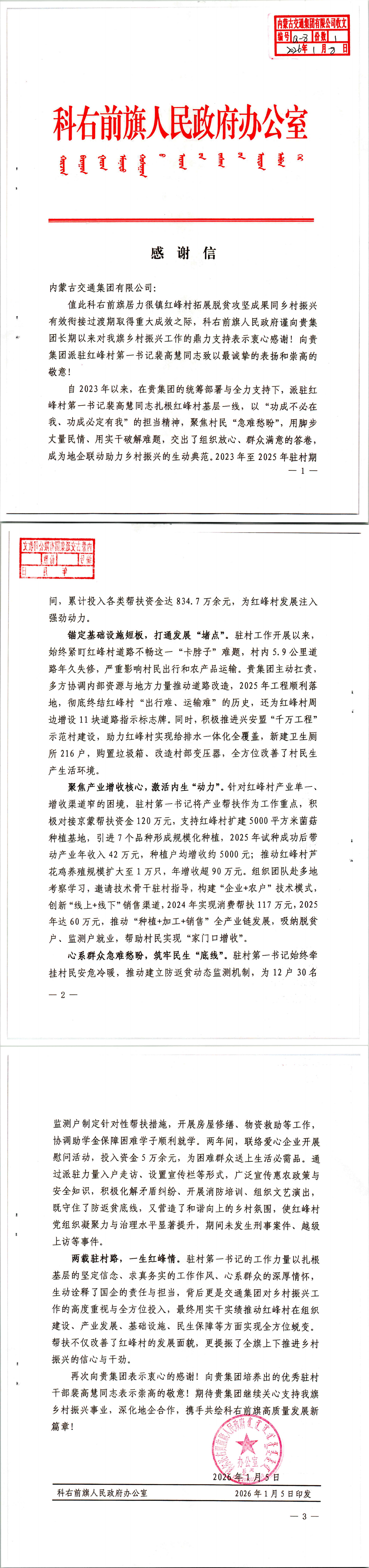 感谢信既是肯定更是鞭策。内蒙古交通集团将始终牢记国企社会责任,把乡村振兴作为重大政治任务,持续深化地企合作,以更实举措、更硬作风,持续激活乡村发展内生动力,助力科右前旗绘就高质量发展新蓝图,让乡村振兴的阳光照亮更多角落,在服务地方发展大局中彰显国企担当。