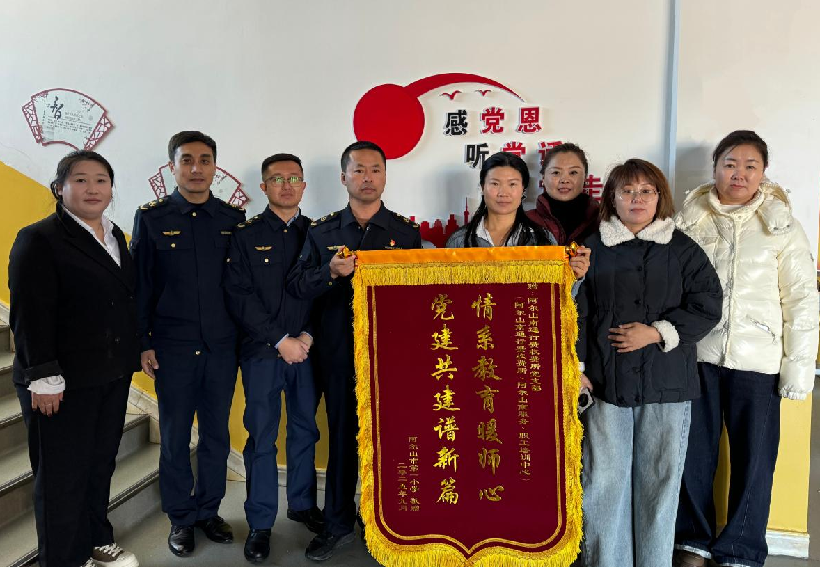 近日,兴安分公司阿尔山南收费所、阿尔山南服务区、职工培训中心,共同收到阿尔山市第一小学赠送的“情系教育暖师心,党建共建谱新篇”锦旗,这面锦旗既是对三家单位联合开展“教师节”慰问活动的高度肯定,更凝聚着校企双方深化党建共建、共促教育发展的深厚情谊。