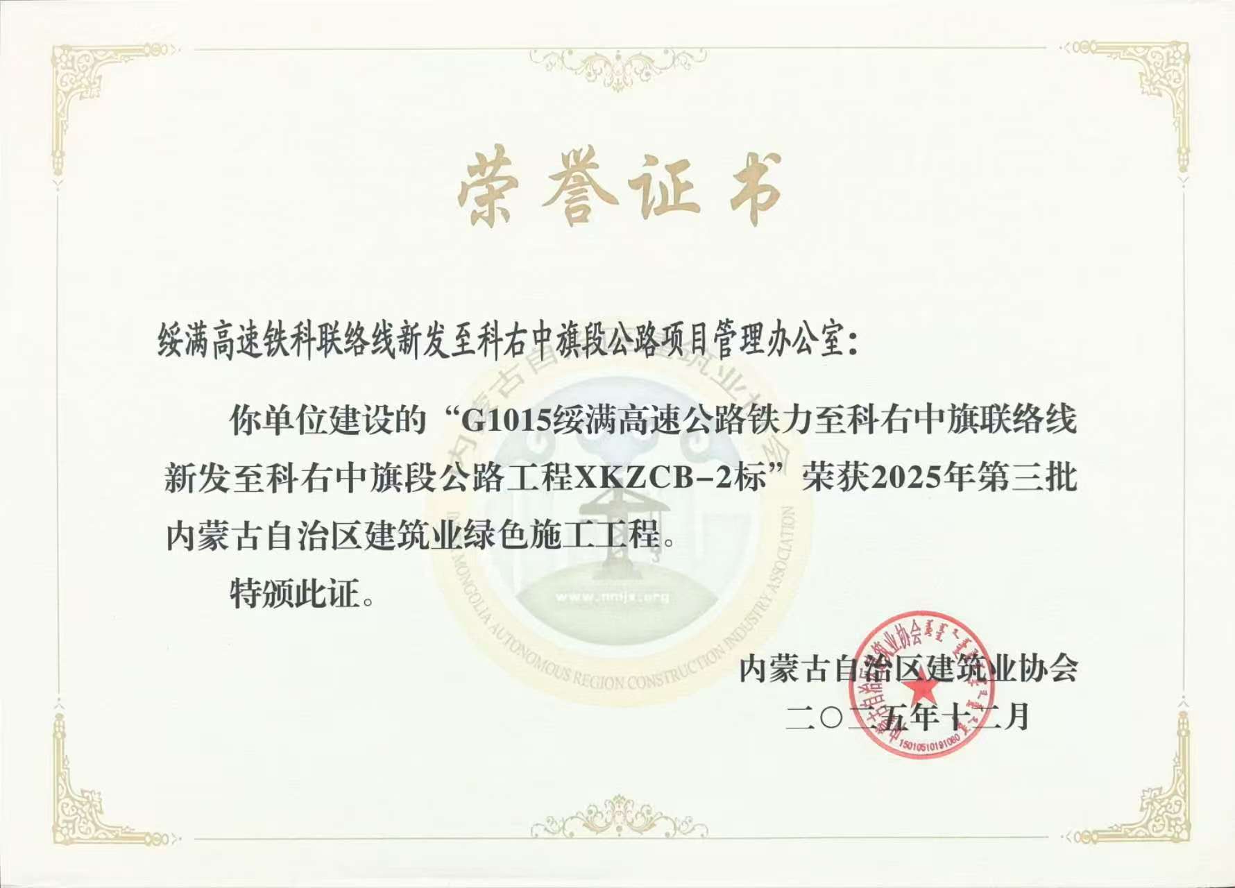 G1015绥满高速公路铁力至科右中旗联络线(蒙吉界)至科右中旗段高速公路项目,凭借先进的施工管理理念与科技创新成果,成功荣获内蒙古建筑业协会颁发的“内蒙古自治区优质结构工程”“内蒙古自治区建筑业绿色施工工程”“内蒙古自治区建筑业新技术应用工程”三项省级荣誉。