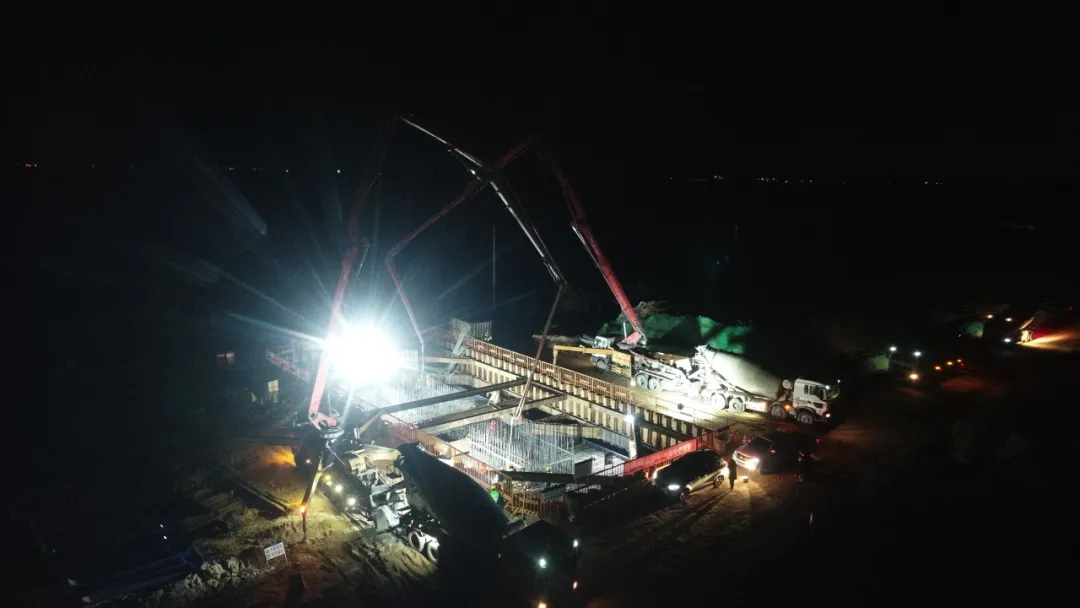 在为期两个月的攻坚战中,现场实行24小时轮班作业,建设者们发扬“白加黑”连续作战精神,累计完成混凝土浇筑约16000方、钢筋安装2100余吨。施工现场机械轰鸣、车辆有序穿梭,技术人员精准把控每个环节,安全人员全程巡查护航,共同绘就了一幅热火朝天的奋斗画卷,生动诠释了“风清气正、实干担当”的团队风貌。