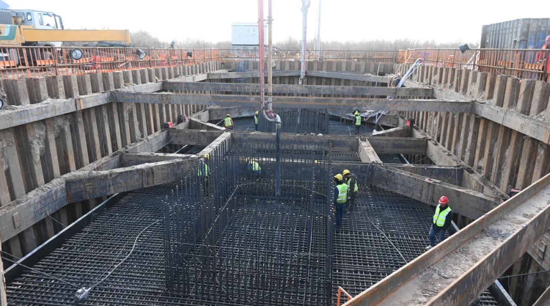 面对黄河滩地8米深基坑、复杂地质及紧迫工期等多重挑战,项目团队秉持“团结务实、创新担当、风清气正”的企业精神,迎难而上、科学施策。创新采用“CFG螺旋钻引孔+水刀法”高压射水组合辅助沉桩工艺,成功攻克了粉砂层与硬塑黏泥地质条件下的钢板桩插打难题;通过优化冷却水管设计、布设智能温控系统,确保单座1300余方大体积混凝土浇筑质量全程受控。