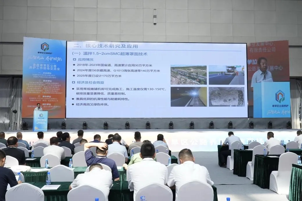 米世忠在汇报中表示,内蒙古作为北疆交通要塞,公路网穿越草原、沙漠、高原等复杂地形,公路养护常年面临高寒、干旱、强紫外线等极端气候挑战。内蒙古聚焦“交通强国”战略,以地域特色及公路养护实际需求为出发点,重点培育包括:温拌1.5-2cm SMC超薄罩面技术;大掺量厂拌温再生技术;沥青路面热风微波复合就地热再生技术;大宗固废钢渣梯级利用技术;养护安全作业闯入预警成套技术;SMC纤维复合防眩格栅在内的6项核心技术,构建了适应寒旱区特点的“蒙式养护”技术体系。该体系形成覆盖“材料-工艺-安全-环保”的全链条解决方案,全面提升了寒旱区公路养护的适应性与可持续性。