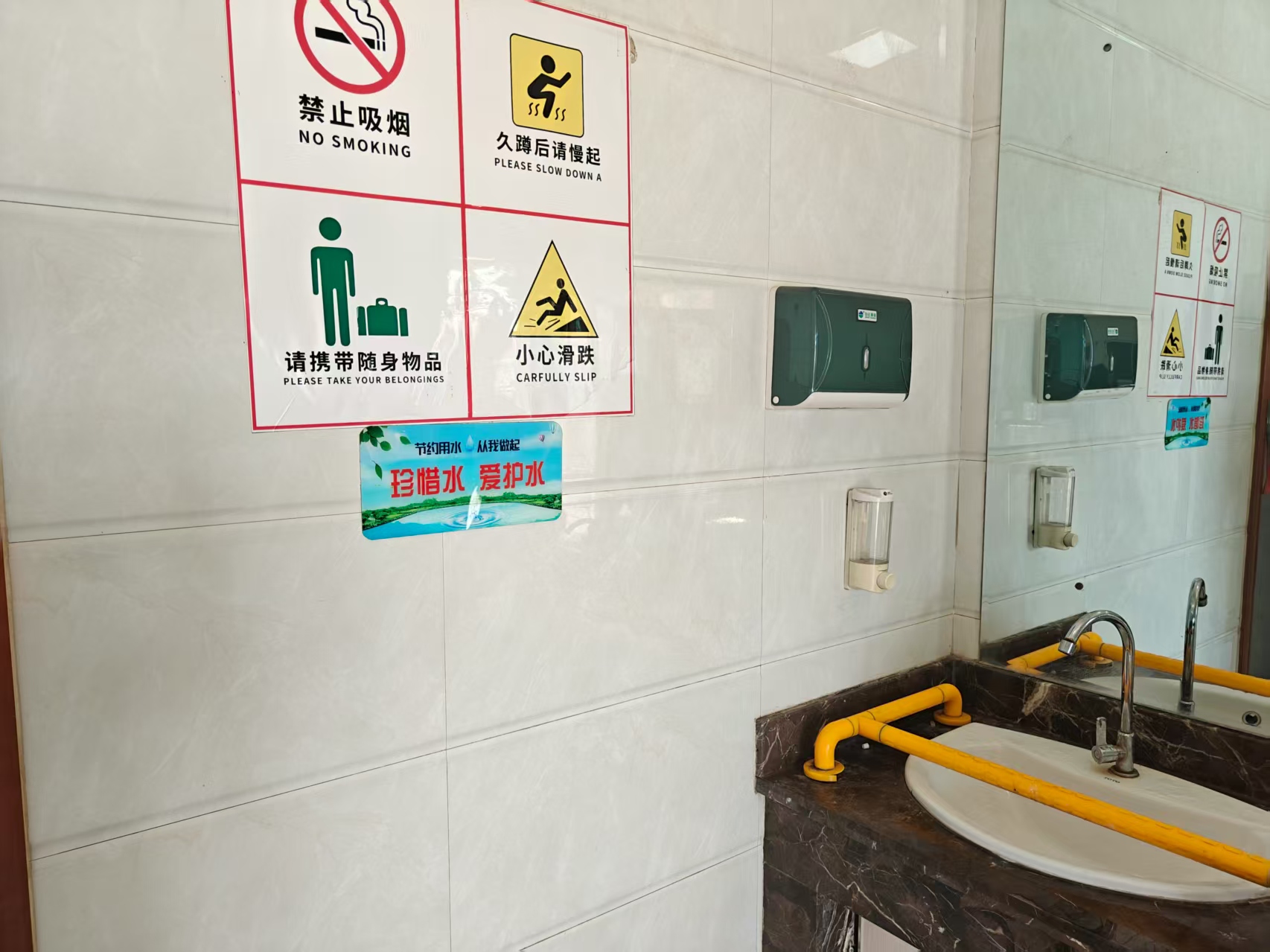 走进服务区公共卫生间,洗手台镜面旁、隔间门内侧,一张张设计简约的“温馨提示”格外醒目。“请携带好随身物品”的标语,温柔提醒着匆忙赶路的司乘收好手机、钱包等物品;湿滑的洗手台区域,“小心跌倒、节约用水从我做起”的提示搭配防滑图案,则将环保理念融入日常,引导大家珍惜资源。