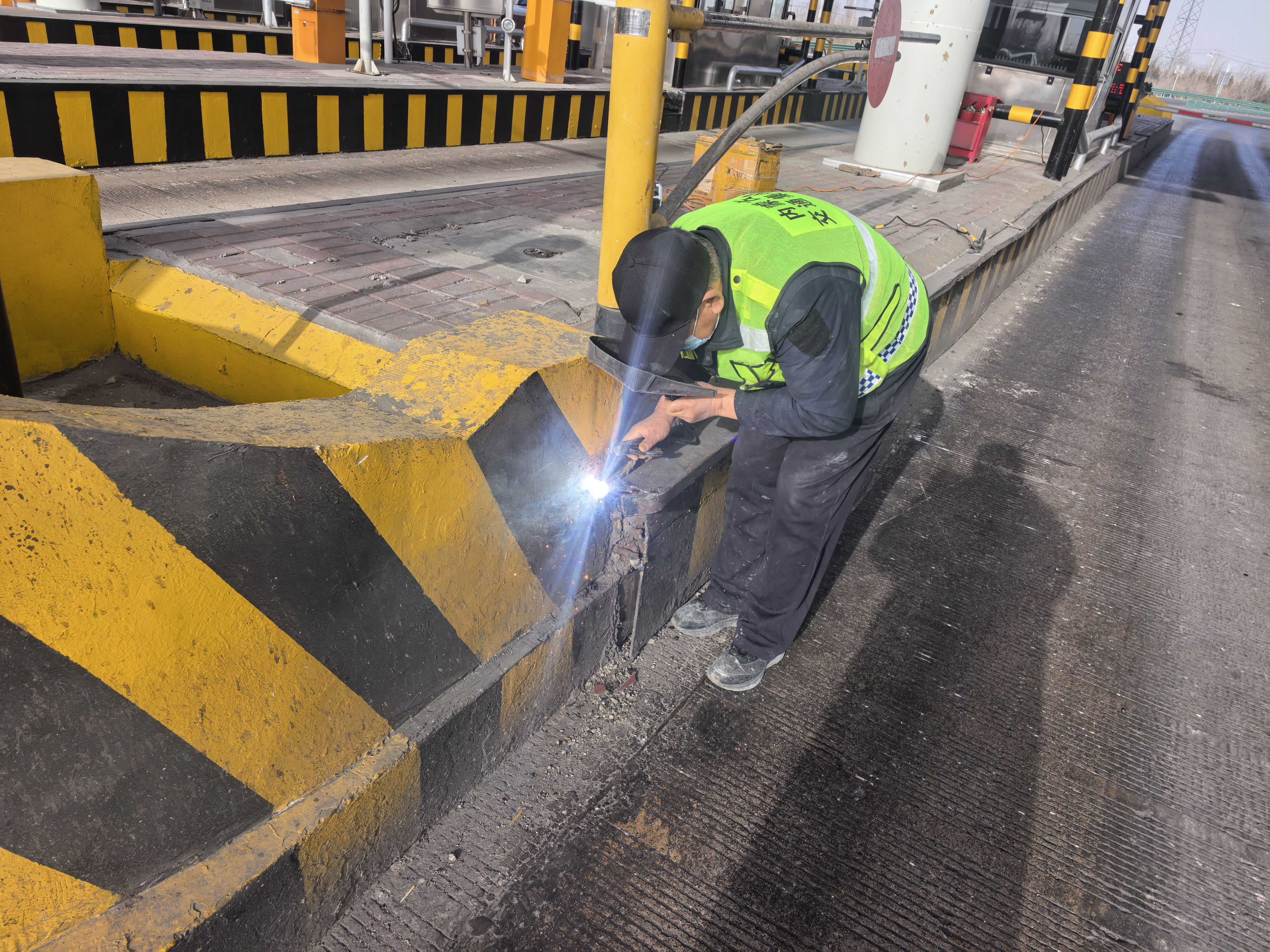 由于长期受车辆剐蹭、碾压及自然环境影响,收费所车道防撞槽钢出现焊缝开裂、局部锈蚀、固定松动等问题,给车道通行安全带来隐患。作业过程中,维修人员严格遵守电焊作业安全规范,佩戴防护面罩、反光背心等防护用具,对破损、松动的防撞槽钢进行精准焊接、加固,逐一修复破损点位,恢复槽钢的结构稳定性和防护性能。