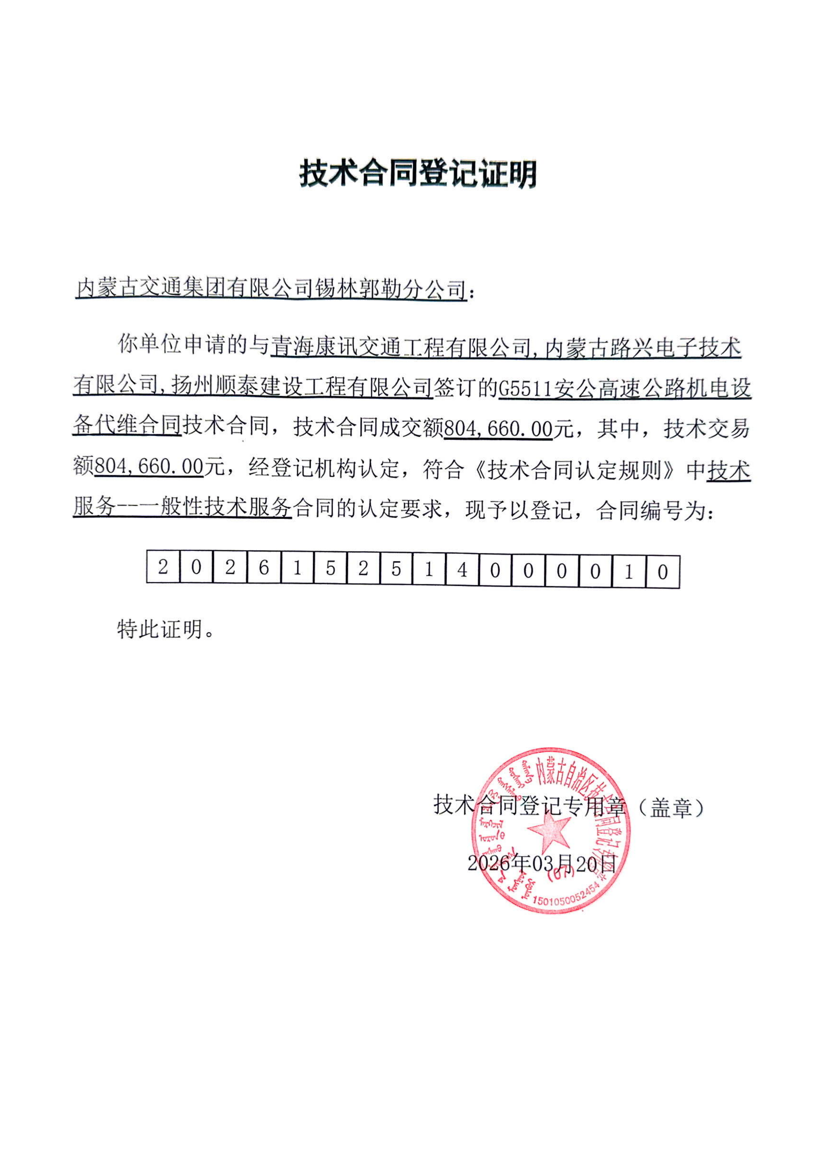 近日,内蒙古交通集团锡林郭勒分公司的《G5511安公高速公路机电设备代维合同》成功通过工业和信息化部技术合同认定登记审核,取得《技术合同登记证明》。这表明该项目的技术属性与规范管理水平获得了国家级权威认可,标志着锡林郭勒分公司在智慧交通运维领域实现专业化、标准化的历史性突破。