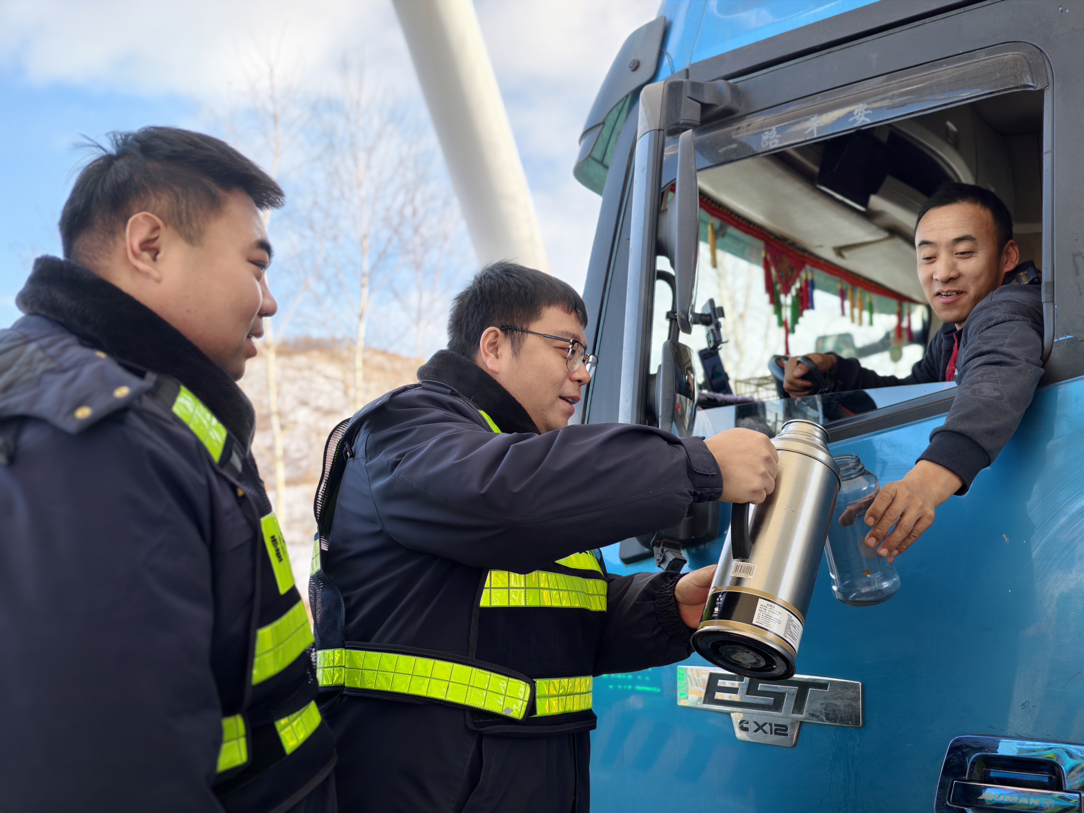 霍尔奇收费所职工坚守岗位一线,在便民服务台,他们热情地为司乘答疑指路,将暖心的热水递到司乘手中,驱散旅途疲惫,以服务传递温情,全力守护节日期间道路畅通与出行平安。