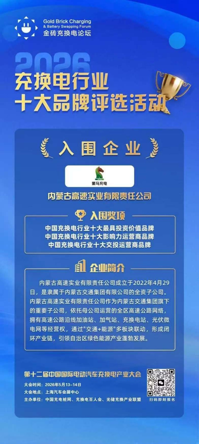 近日,金砖充换电论坛组委会发布“2026中国充换电行业十大品牌”入围名单,内蒙古高速实业有限责任公司旗下的“蒙马充电”品牌凭借优秀的运营能力和突出的投资价值,成功入围中国充换电行业十大最具投资价值品牌、十大影响力运营商品牌、十大交投运营商品牌三个奖项,成为本次评选中交通新能源领域的亮眼标杆。