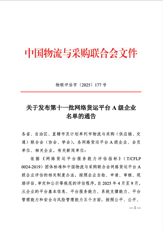 9月27日,根据中国物流与采购联合会《关于发布第十一批网络货运平台A级企业名单的公告》(物联评估字〔2025〕177号),内蒙古交通集团数字物流科技有限公司被授予“网络货运平台4A级企业”称号。这不仅是对公司扛牢使命职责、奋力推动发展的肯定,更为公司做强做优数字物流产业,带动引领自治区物流产业向集约化、数字化、规模化方向发展提供了强大动力。
