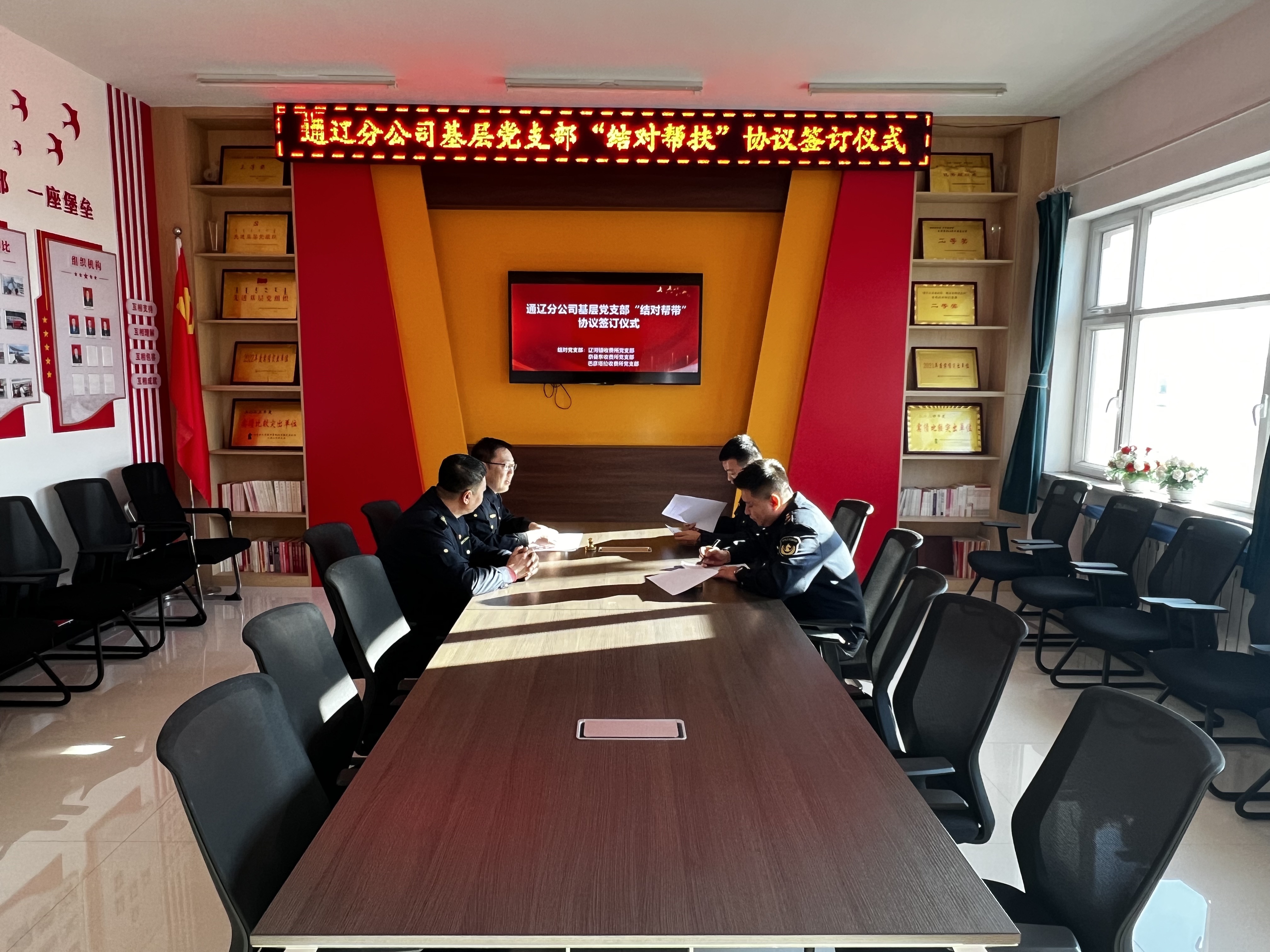 为深入落实内蒙古交通集团有限公司通辽分公司党委“老带新、强带弱”结对帮带机制要求,充分发挥先进党支部示范引领作用,近日,辽河镇收费所党支部与巴彦塔拉收费所党支部、奈曼东收费所党支部举行结对帮带协议签订仪式,各党支部书记及党员代表参加活动。