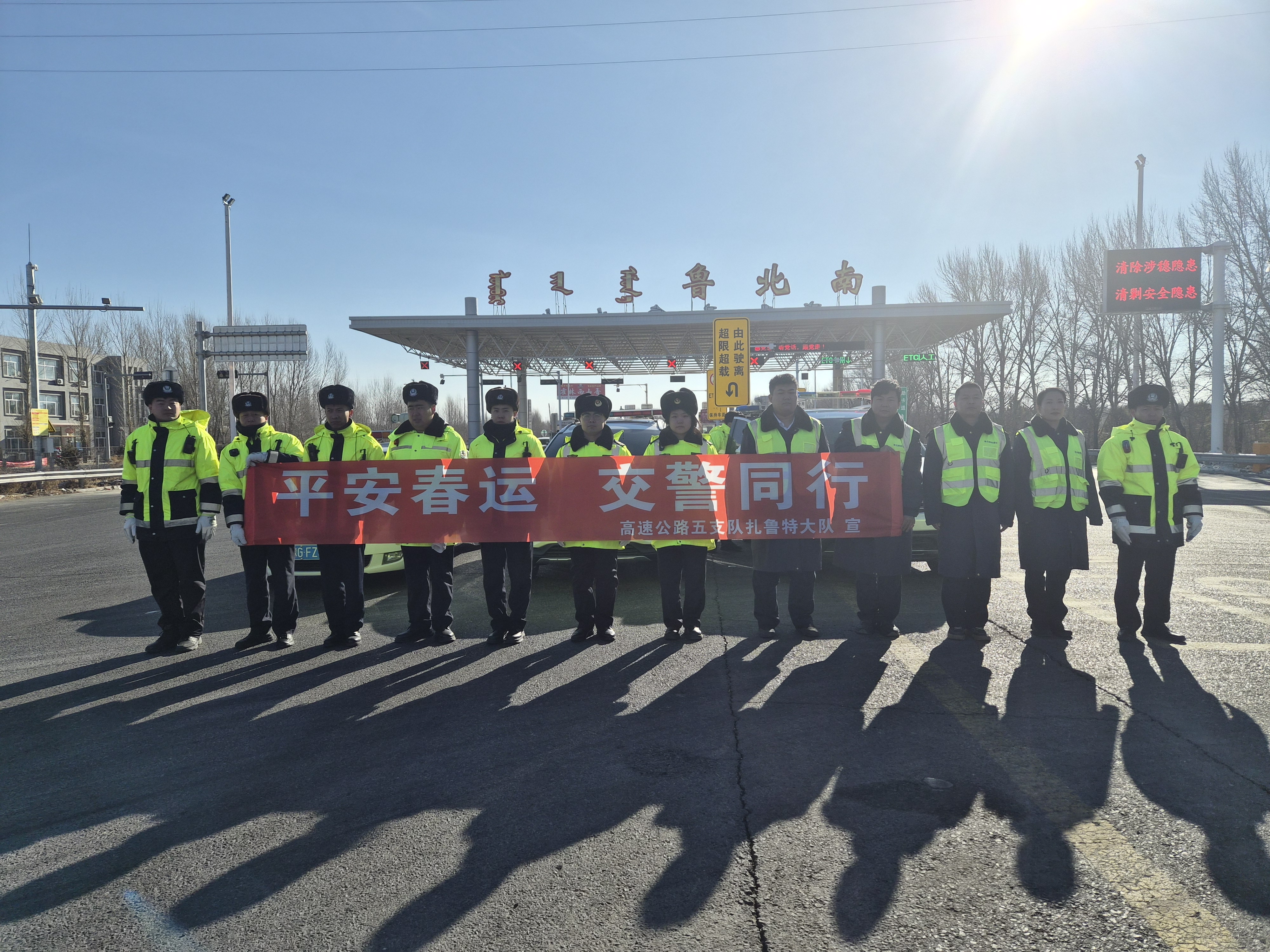 伴随着春运大幕的正式拉开,近日,内蒙古交通集团通辽分公司鲁北南收费所依托“一路四方”联勤联动体系,联合高速交警扎鲁特大队、路政支队第二大队和鲁北养护作业中心,在鲁北南收费广场共同开展2026年春运保通保畅工作启动仪式。