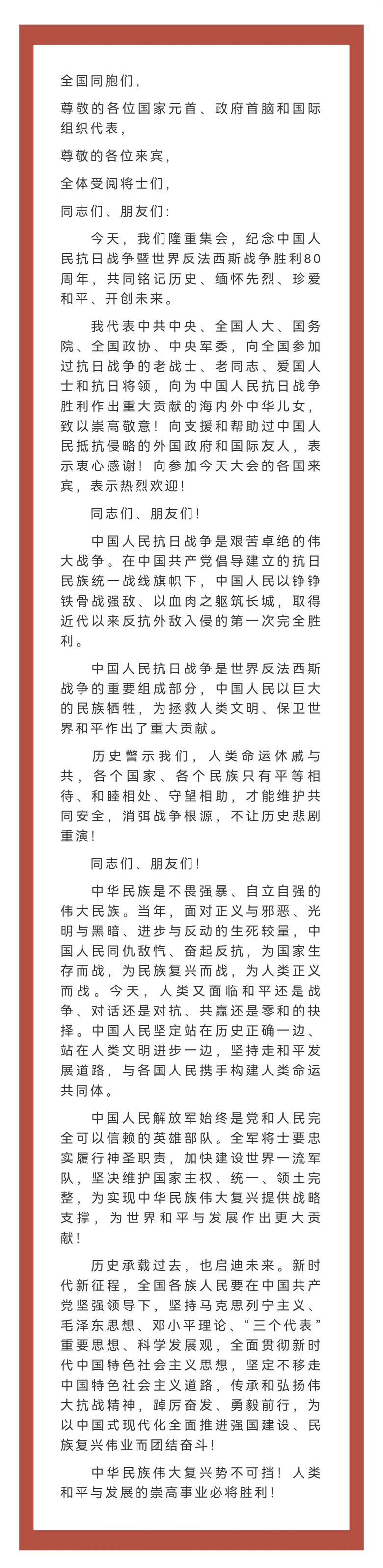 习近平:在纪念中国人民抗日战争暨世界反法西斯战争胜利80周年大会上的讲话