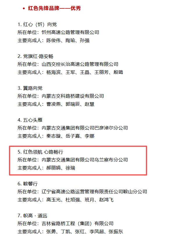 此次获评“红色先锋优秀品牌”,不仅是对乌兰察布分公司党建工作的激励,更是对分公司以高质量党建引领企业高质量发展路径的充分肯定。分公司将以此次荣誉为新的起点,继续巩固品牌成果,拓展品牌内涵,提升品牌影响力,努力打造公路交通行业党建与业务融合发展的示范标杆。