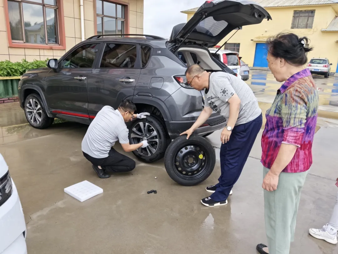 值班所长陈勇和收费所职工曹俊取来维修工具,先用千斤顶将车辆顶起,又熟练地拆卸螺丝、更换备胎,安装完成后又对全车进行仔细检查,并提醒李女士雨天出行注意事项。收费所工作人员还为李女士准备了玻璃水和矿泉水,李女士紧紧握着工作人员的手连连道谢。