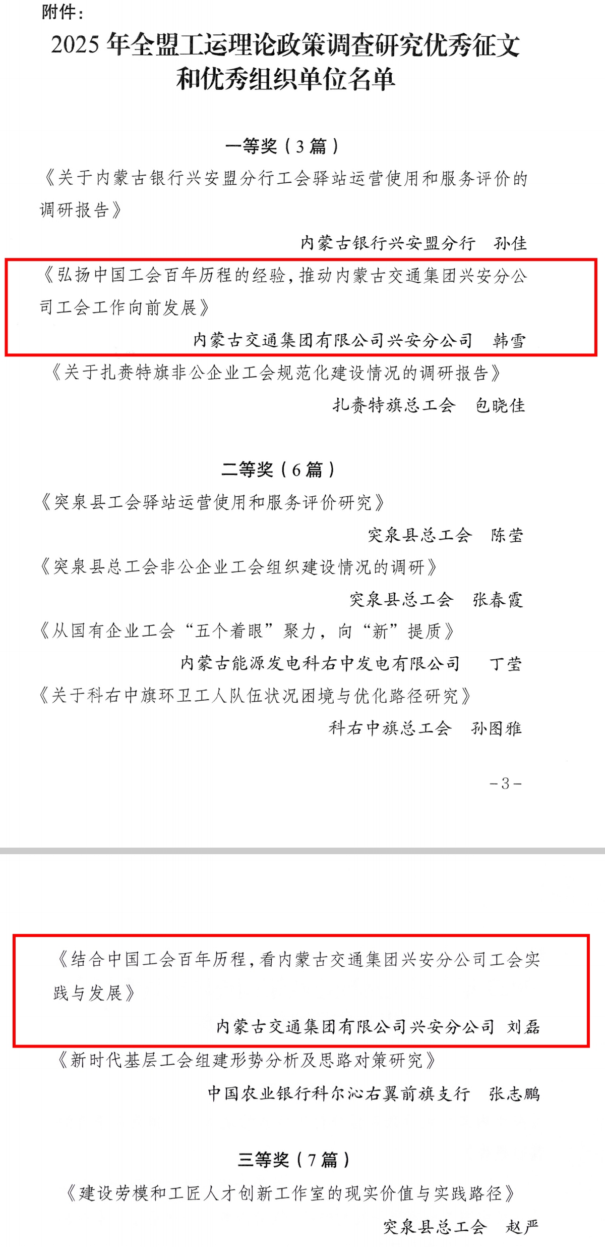 近日,兴安盟工会印发《关于2025年全盟工运理论政策调查研究优秀征文和优秀组织单位的通报》,对全盟优秀征文进行表彰。其中兴安分公司职工韩雪撰写的《弘扬中国工会百年历程的经验,推动内蒙古交通集团兴安分公司工会工作向前发展》征文获一等奖,刘磊撰写的《结合中国工会百年历程,看内蒙古交通集团兴安分公司工会实践与发展》征文获二等奖。