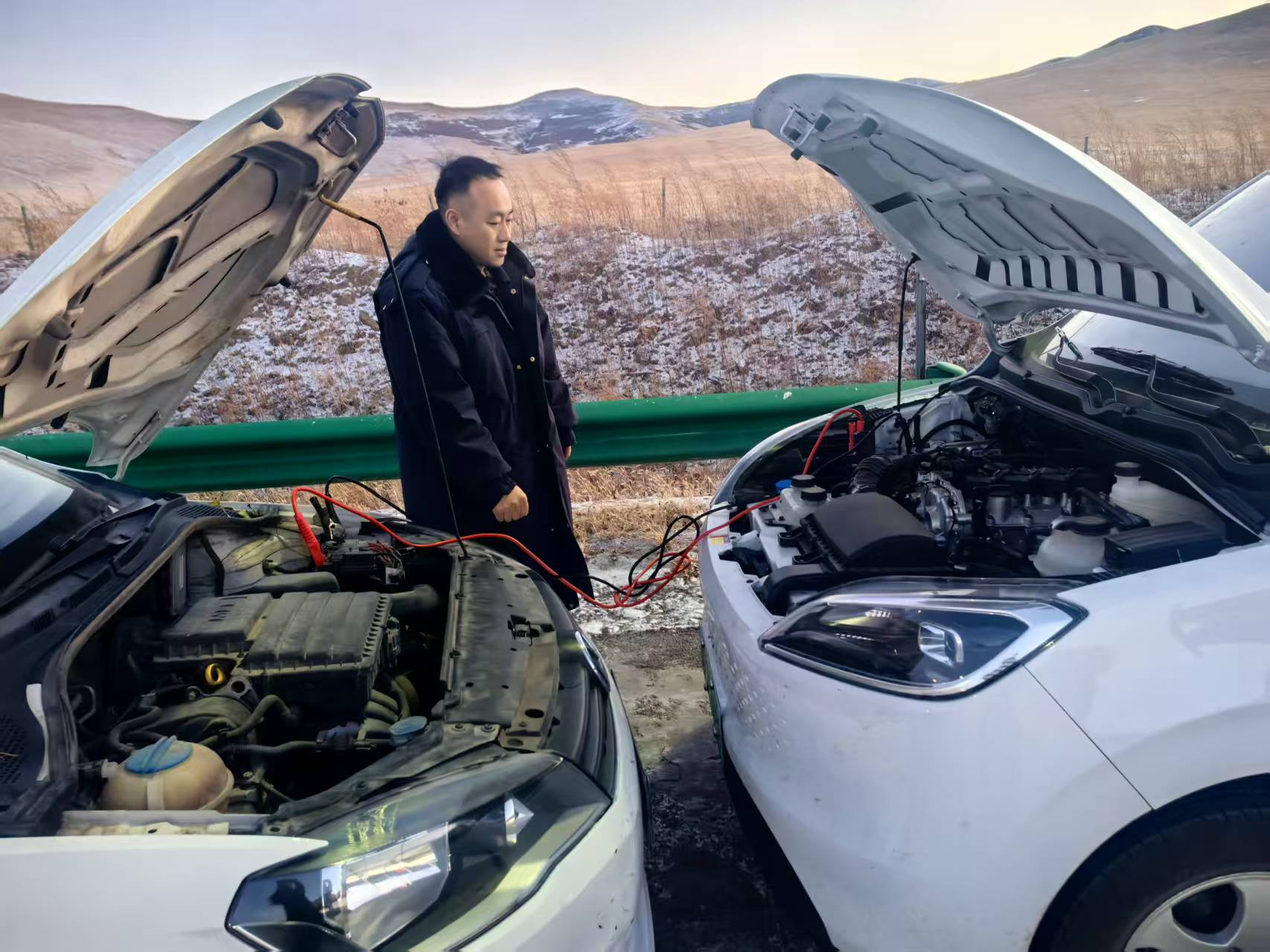 伊尔施收费所、桃合木收费所工作人员为车辆提供搭电服务。(吕再夺、赵祺琪)