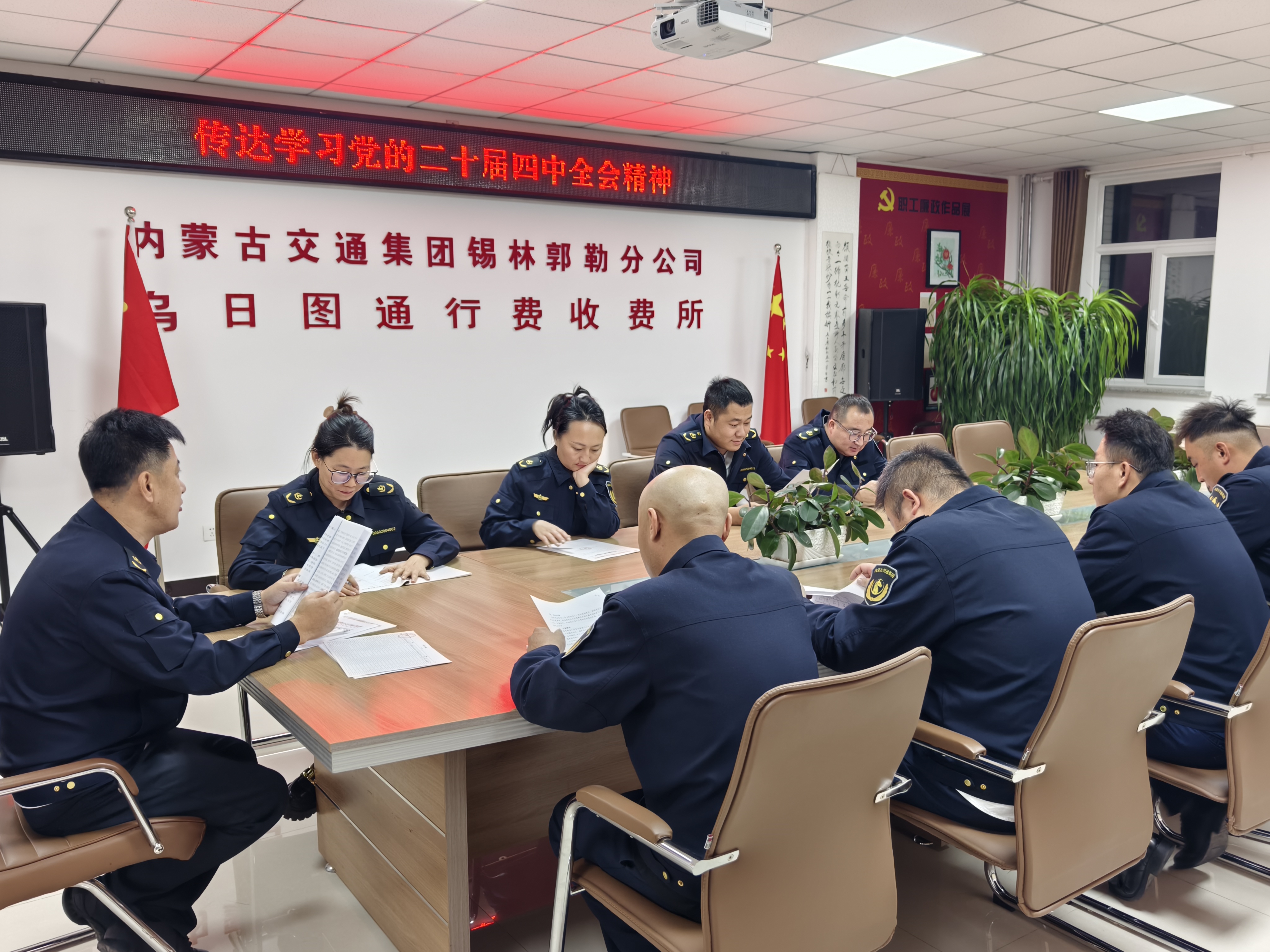 锡林浩特收费所组织党员、职工集中学习党的二十届四中全会精神,会议紧扣全会提出的“推进交通运输高质量发展”的核心要求,结合收费所工作实际,围绕提升通行效率、优化服务质量、强化安全保障等重点任务展开研讨交流。会上,大家结合岗位实际分享学习感悟,深入剖析当前工作中存在的短板弱项,并提出有针对性改进措施。一致表示,将以全会精神为指引,在日常工作中进一步提升业务技能,缩短车辆通行时间,用更热情的服务温暖司乘人员的出行路,全力为过往司乘提供安全、稳定、顺畅的通行环境,以实际行动将全会精神落到实处。