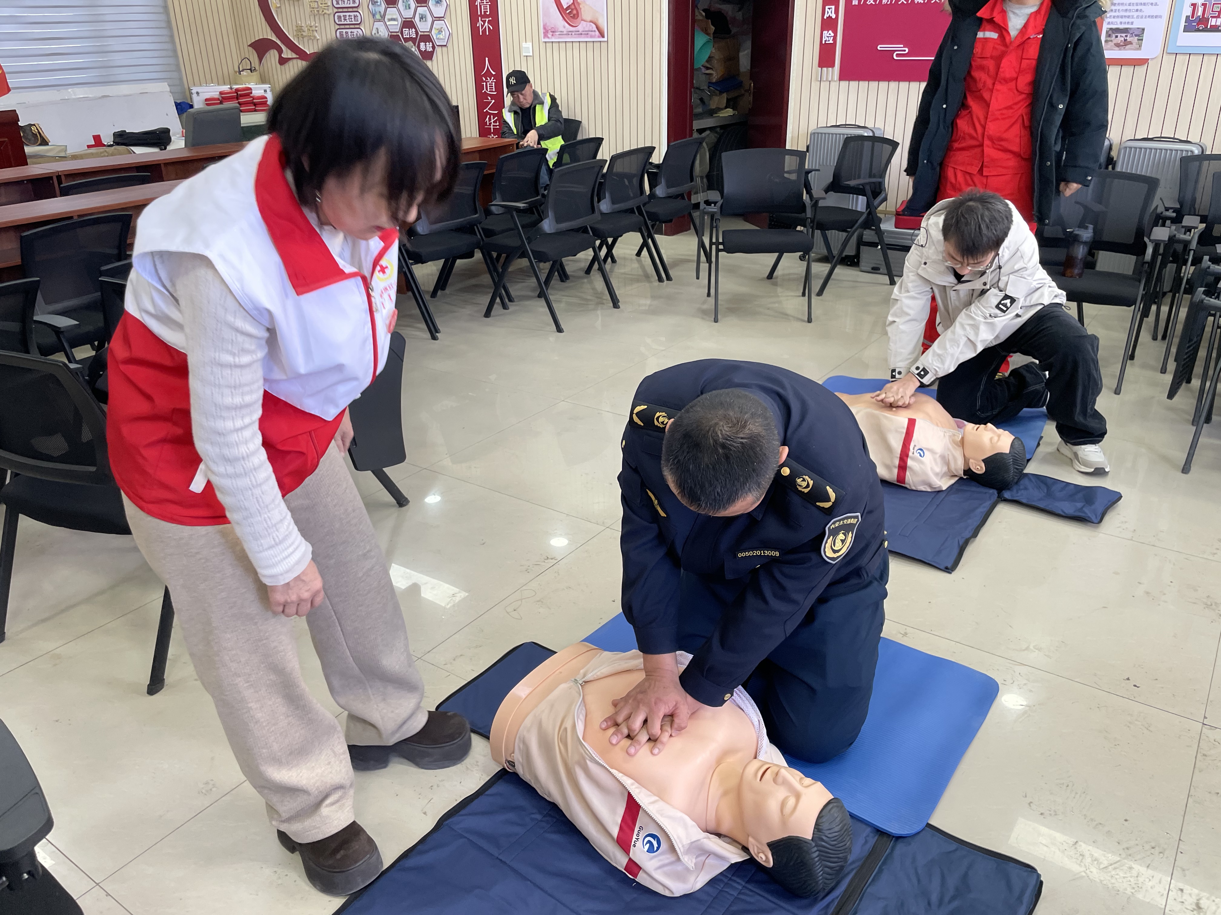 此次培训分为理论教学和实践操作两部分。理论环节围绕急救原则、心肺复苏操作原理等核心内容,采用典型案例剖析、现场要点解读的教学形式深入浅出讲解操作规范与注意事项。实操环节借助专业模拟器具,指导学员分组开展模拟演练,通过手把手示范、一对一纠错的方式,帮助学员掌握动作要领。培训结束后,所站参训学员通过理论考试与实操考核,均取得“红十字救护员证”。